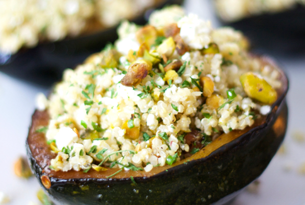 Add parsley, chives, feta cheese, pistachios and salt and black pepper to taste. Divide filling among squash and serve immediately.